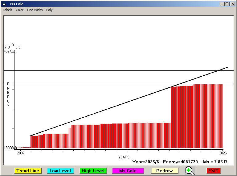 Fig. 10. Expected EQ magnitude due to application of the LSEFM (Lithospheric Seismic Energy Flow Model) on past (since 2024) seismic history of the regional seismogenic area.