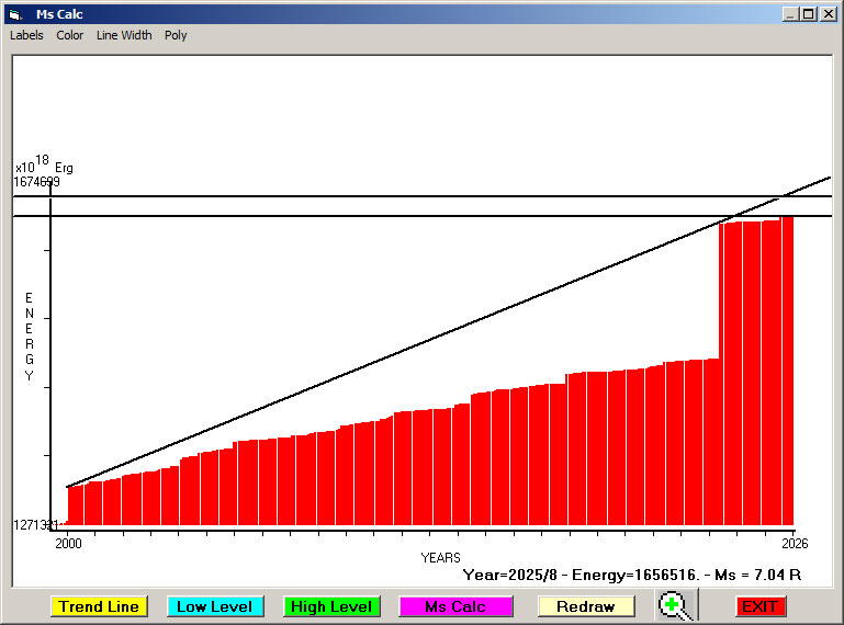Fig. 9. Expected EQ magnitude due to application of the LSEFM (Lithospheric Seismic Energy Flow Model) on past (since 2023) seismic history of the regional seismogenic area.