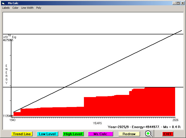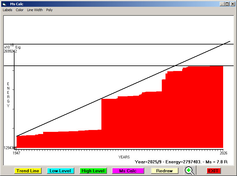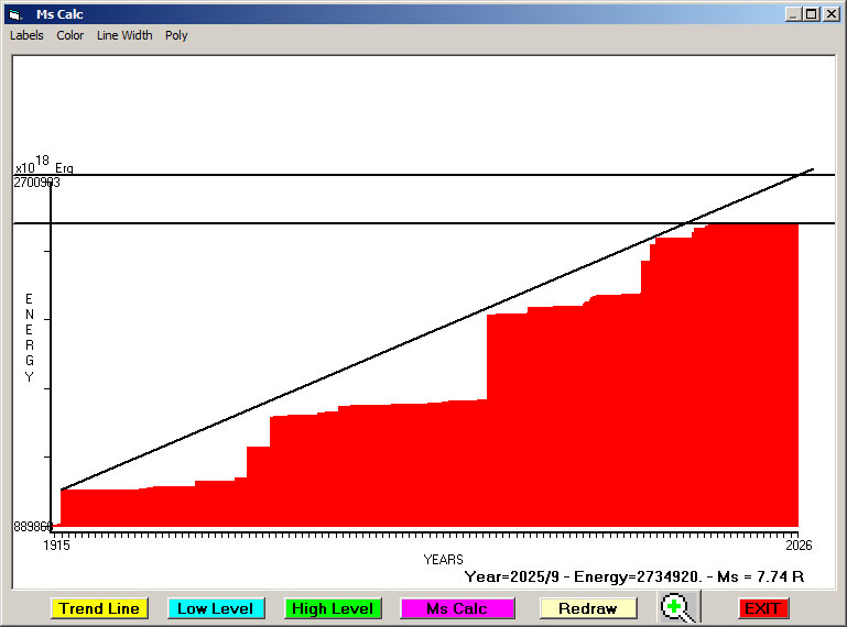 Fig. 5. Expected EQ magnitude due to application of the LSEFM (Lithospheric Seismic Energy Flow Model) on past (since 1915) seismic history of the regional seismogenic area.