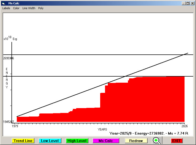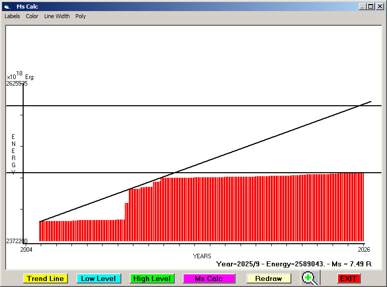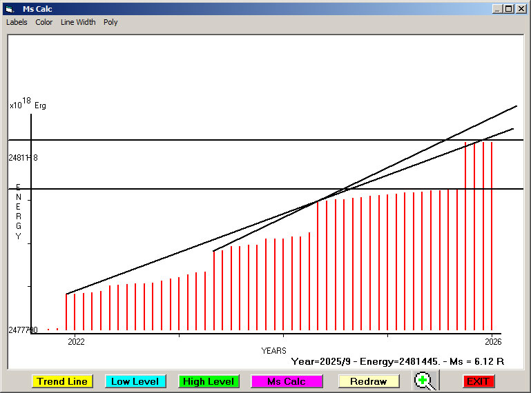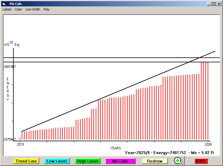Fig. 11. Expected EQ magnitude due to application of the LSEFM (Lithospheric Seismic Energy Flow Model) on past (since 2022-2023) seismic history of the regional seismogenic area.