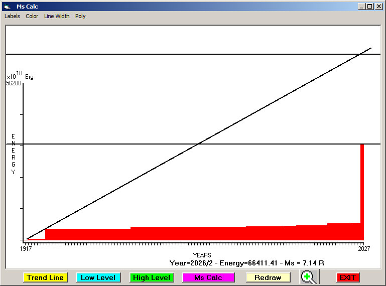 Fig. 5. Expected EQ magnitude due to application of the LSEFM (Lithospheric Seismic Energy Flow Model) on past (since 1917) seismic history of the regional seismogenic area.