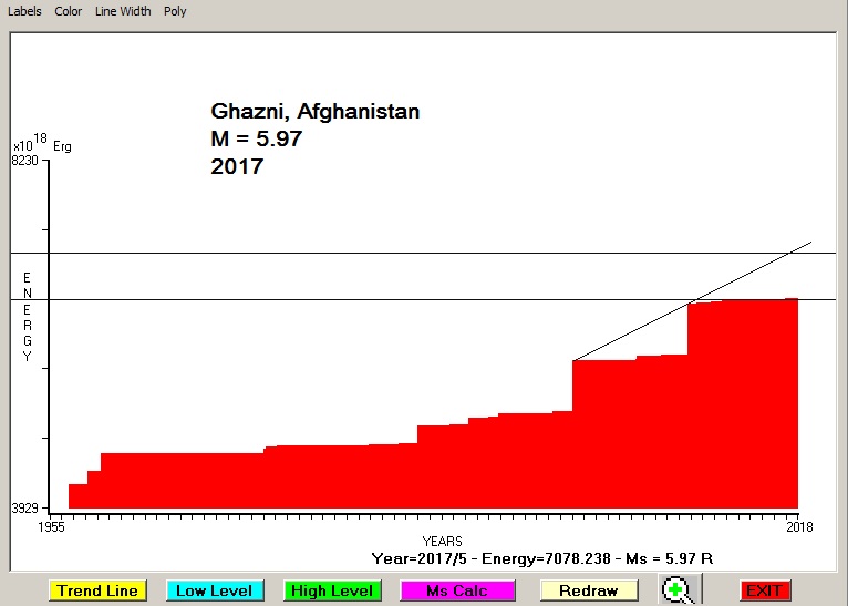 City : Ghazni, Afghanistan. Geographical coordinates : Lat : 33.554 N - Lon : 68.421 E Data base used : USGS (May, 2017). Radius of regional seismogenic area : 150 Km. Accumulated seismic energy expressed in terms of EQ magnitude : M = 5.97 Fig. 1. Equivalent EQ magnitude due to application of the LSEFM (Lithospheric Seismic Energy Flow Model) on past seismic history of the regional seismogenic area.