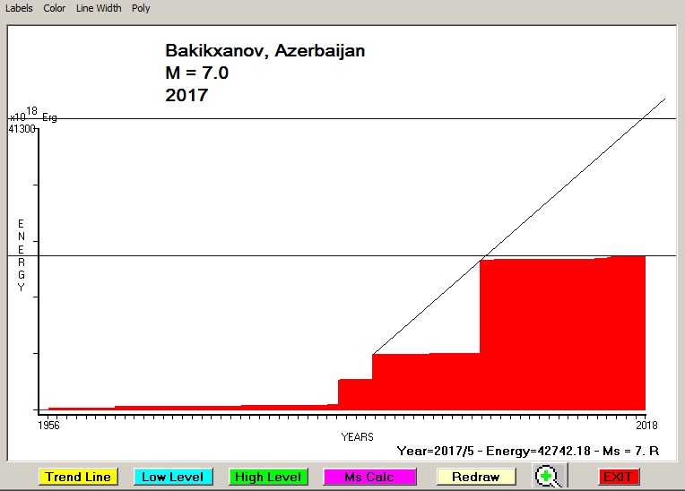 City : Bakikxanov, Azerbaijan. Geographical coordinates : Lat : 40.419 N - Lon : 49.967 E Data base used : USGS (May, 2017). Radius of regional seismogenic area : 150 Km. Accumulated seismic energy expressed in terms of EQ magnitude : M = 7.0 Fig. 1. Equivalent EQ magnitude due to application of the LSEFM (Lithospheric Seismic Energy Flow Model) on past seismic history of the regional seismogenic area.