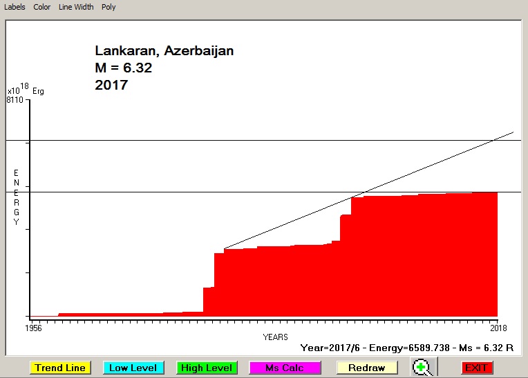 City : Lankaran, Azerbaijan. Geographical coordinates : Lat : 38.754 N - Lon : 48.851 E Data base used : USGS (May, 2017). Radius of regional seismogenic area : 150 Km. Accumulated seismic energy expressed in terms of EQ magnitude : M = 6.32 Fig. 1. Equivalent EQ magnitude due to application of the LSEFM (Lithospheric Seismic Energy Flow Model) on past seismic history of the regional seismogenic area.