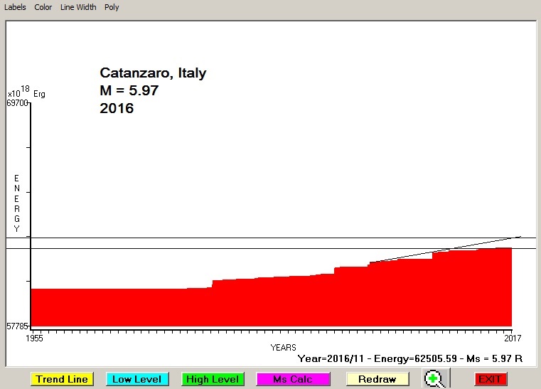 City : Catanzaro, Italy. Geographical coordinates : Lat : 38.92 N - Lon : 16.58 E Data base used : USGS (November, 2016). Radius of regional seismogenic area : 150 Km. Accumulated seismic energy expressed in terms of EQ magnitude : M = 5.97 Fig. 1. Equivalent EQ magnitude due to application of the LSEFM (Lithospheric Seismic Energy Flow Model) on past seismic history of the regional seismogenic area.