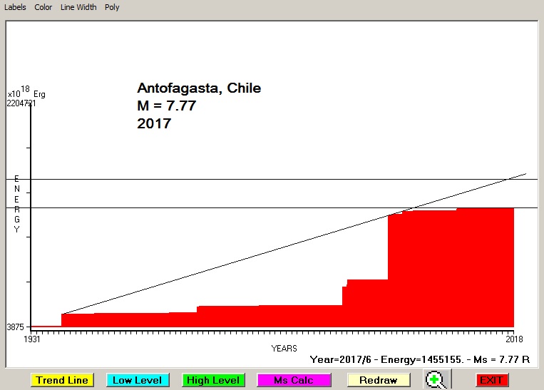 City : Antofagasta, Chile. Geographical coordinates : Lat : -23.652 S - Lon : -70.395 W Data base used : USGS (May, 2017). Radius of regional seismogenic area : 150 Km. Accumulated seismic energy expressed in terms of EQ magnitude : M = 7.77 Fig. 1. Equivalent EQ magnitude due to application of the LSEFM (Lithospheric Seismic Energy Flow Model) on past seismic history of the regional seismogenic area.