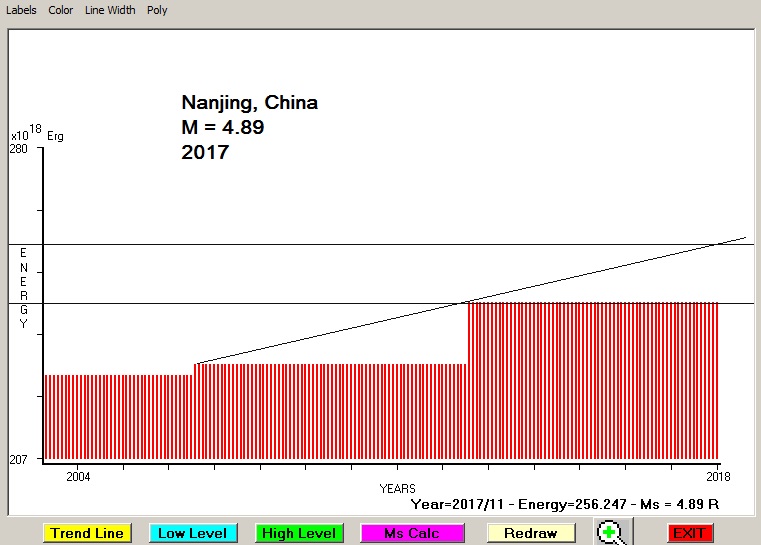 City : Nanjing, China. Geographical coordinates : Lat : 32.062 N - Lon : 118.778 E Data base used : USGS (November, 2017). Radius of regional seismogenic area : 150 Km. Accumulated seismic energy expressed in terms of EQ magnitude : M = 4.89 Fig. 1. Equivalent EQ magnitude due to application of the LSEFM (Lithospheric Seismic Energy Flow Model) on past seismic history of the regional seismogenic area.