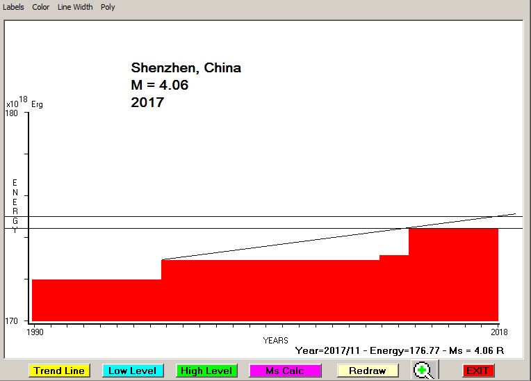 City : Shenzhen , China. Geographical coordinates : Lat : 22.546 N - Lon : 114.068 E Data base used : USGS (November, 2017). Radius of regional seismogenic area : 150 Km. Accumulated seismic energy expressed in terms of EQ magnitude : M = 4.06 Fig. 1. Equivalent EQ magnitude due to application of the LSEFM (Lithospheric Seismic Energy Flow Model) on past seismic history of the regional seismogenic area.