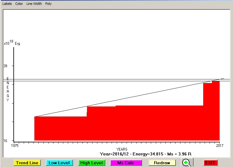 City : Cluj-Napoka, Romania. Geographical coordinates : Lat : 46.767 N - Lon : 23.6 E Data base used : USGS (November, 2016). Radius of regional seismogenic area : 150 Km. Accumulated seismic energy expressed in terms of EQ magnitude : M = 3.96 Fig. 1. Equivalent EQ magnitude due to application of the LSEFM (Lithospheric Seismic Energy Flow Model) on past seismic history of the regional seismogenic area.