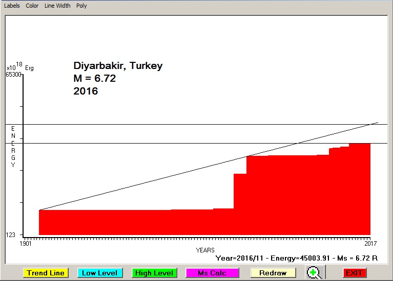 City : Diyarbakir, Turkey. Geographical coordinates : Lat : 37.93 N - Lon : 40.21 E Data base used : USGS (December, 2016). Radius of regional seismogenic area : 150 Km. Accumulated seismic energy expressed in terms of EQ magnitude : M = 6.72 Fig. 1. Equivalent EQ magnitude due to application of the LSEFM (Lithospheric Seismic Energy Flow Model) on past seismic history of the regional seismogenic area.
