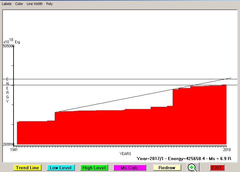 City : Manta, Ecuador. Geographical coordinates : Lat : -0.962 S - Lon : -80.713 W Data base used : USGS (January, 2017). Radius of regional seismogenic area : 150 Km. Accumulated seismic energy expressed in terms of EQ magnitude : M = 6.90 Fig. 1. Equivalent EQ magnitude due to application of the LSEFM (Lithospheric Seismic Energy Flow Model) on past seismic history of the regional seismogenic area.