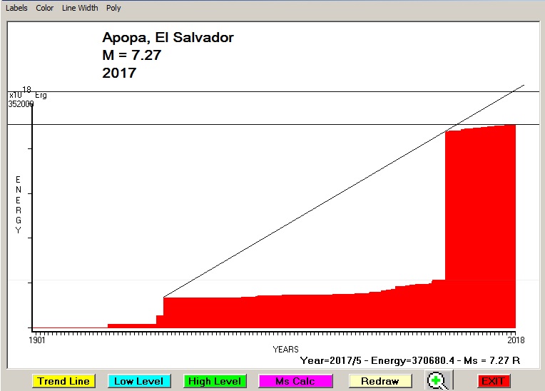 City : Apopa, El Salvador. Geographical coordinates : Lat : 13.807 N - Lon : -89.179 W Data base used : USGS (May, 2017). Radius of regional seismogenic area : 150 Km. Accumulated seismic energy expressed in terms of EQ magnitude : M = 7.27 Fig. 1. Equivalent EQ magnitude due to application of the LSEFM (Lithospheric Seismic Energy Flow Model) on past seismic history of the regional seismogenic area.