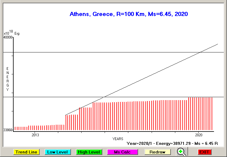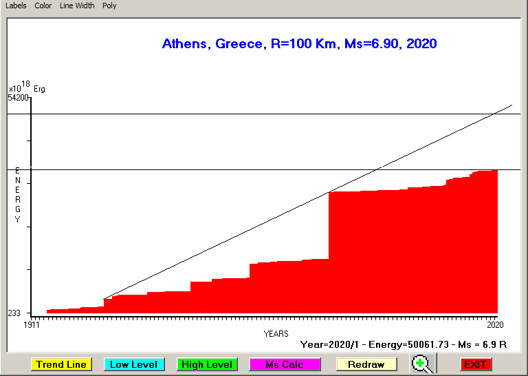 City : Athens, Greece Geographical coordinates : Lat : 37.99 N - Lon : 23.73 E Data base used : GEIN - NOA (January, 2020). Radius of regional seismogenic area : 100 Km. Accumulated seismic energy expressed in terms of EQ magnitude : Ms = 6.90 (since 1911) Ms = 6.45 (since 2012) Fig. 1. Equivalent EQ magnitude due to application of the LSEFM (Lithospheric Seismic Energy Flow Model) on past (since 1911) seismic history of the regional seismogenic area.