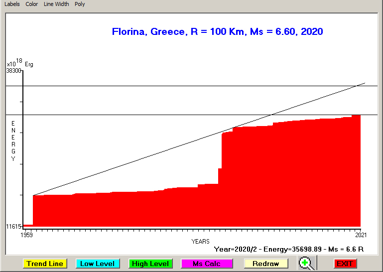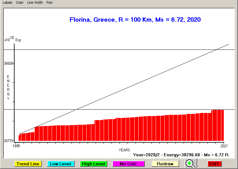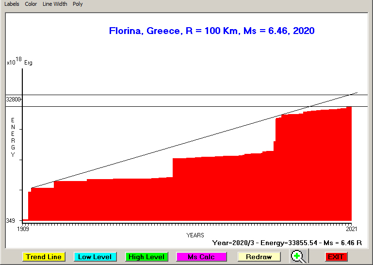 City : Florina, Greece Geographical coordinates : Lat : 40.79 N - Lon : 21.41 E Data base used : GEIN - NOA (February, 2020). Radius of regional seismogenic area : 100 Km. Accumulated seismic energy expressed in terms of EQ magnitude : Ms = 6.46 (since 1909) Ms = 6.60 (since 1959) Ms = 6.72 (since 1995) Fig. 1. Equivalent EQ magnitude due to application of the LSEFM (Lithospheric Seismic Energy Flow Model) on past (since 1909) seismic history of the regional seismogenic area.