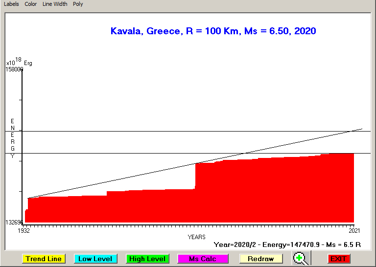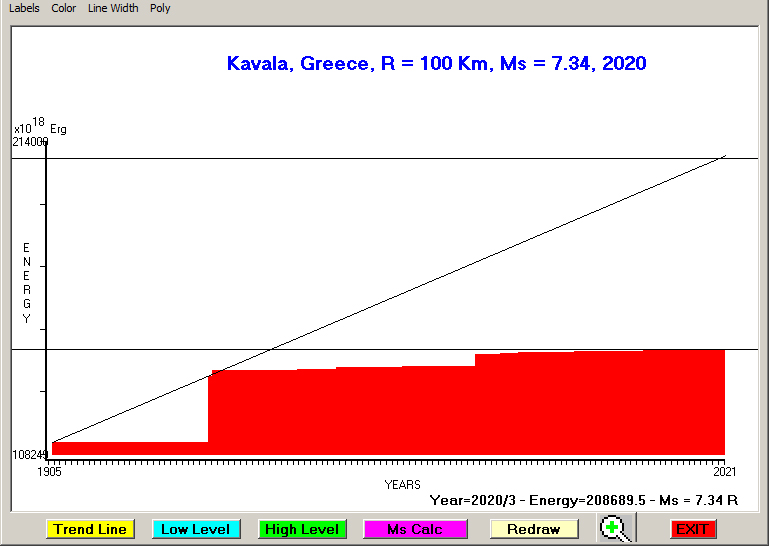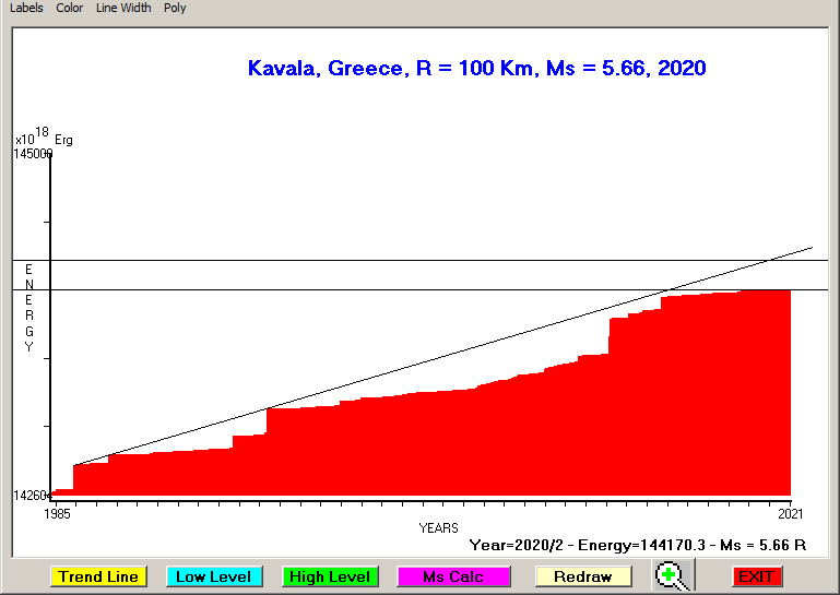 City : Kavala, Greece Geographical coordinates : Lat : 40.94 N - Lon : 24.40 E Data base used : GEIN - NOA (February, 2020). Radius of regional seismogenic area : 100 Km. Accumulated seismic energy expressed in terms of EQ magnitude : Ms = 7.34 (since 1905) Ms = 6.50 (since 1932) Ms = 5.66 (since 1985) Fig. 1. Equivalent EQ magnitude due to application of the LSEFM (Lithospheric Seismic Energy Flow Model) on past (since 1905) seismic history of the regional seismogenic area.