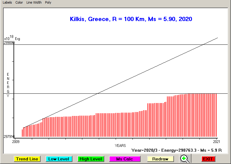 City : Kilkis, Greece Geographical coordinates : Lat : 40.99 N - Lon : 22.87 E Data base used : GEIN - NOA (February, 2020). Radius of regional seismogenic area : 100 Km. Accumulated seismic energy expressed in terms of EQ magnitude : Ms = 7.47 (since 1903) Ms = 6.41 (since 1932) Ms = 6.25 (since 1978) Ms = 5.90 (since 2009) Fig. 1. Equivalent EQ magnitude due to application of the LSEFM (Lithospheric Seismic Energy Flow Model) on past (since 1903) seismic history of the regional seismogenic area.