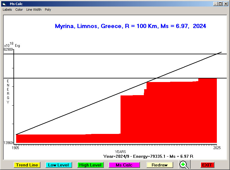City : Myrina, Limnos, Greece Geographical coordinates : Lat : 39.87 N - Lon : 25.06 E Data base used : GEIN - NOA (August, 2024). Radius of regional seismogenic area : 100 Km. Accumulated seismic energy expressed in terms of EQ magnitude : Ms = 6.97 (since 1905) Ms = 7.03 (since 1968) Ms = 6.01 (since 1983) Ms = 5.70 (since 2014) Fig. 1. Equivalent EQ magnitude due to application of the LSEFM (Lithospheric Seismic Energy Flow Model) on past (since 1905) seismic history of the regional seismogenic area.