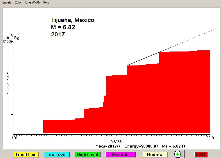 City : Tijuana, Mexico. Geographical coordinates : Lat : 32.503 N - Lon : -117.004 W Data base used : USGS (May, 2017). Radius of regional seismogenic area : 150 Km. Accumulated seismic energy expressed in terms of EQ magnitude : M = 6.82 Fig. 1. Equivalent EQ magnitude due to application of the LSEFM (Lithospheric Seismic Energy Flow Model) on past seismic history of the regional seismogenic area.