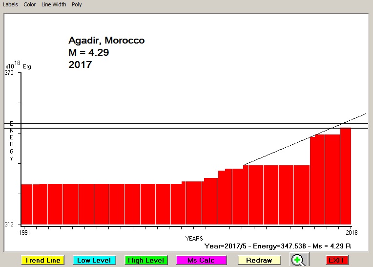 City : Agadir, Morocco. Geographical coordinates : Lat : 30.42 N - Lon : -9.598 W Data base used : USGS (May, 2017). Radius of regional seismogenic area : 150 Km. Accumulated seismic energy expressed in terms of EQ magnitude : M = 4.29 Fig. 1. Equivalent EQ magnitude due to application of the LSEFM (Lithospheric Seismic Energy Flow Model) on past seismic history of the regional seismogenic area.