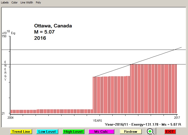 City : Ottawa, Canada. Geographical coordinates : Lat : 45.43 N - Lon : 75.70 W Data base used : USGS (November, 2016). Radius of regional seismogenic area : 150 Km. Accumulated seismic energy expressed in terms of EQ magnitude : M = 5.07 Fig. 1. Equivalent EQ magnitude due to application of the LSEFM (Lithospheric Seismic Energy Flow Model) on past seismic history of the regional seismogenic area.