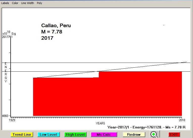 City : Callao, Peru. Geographical coordinates : Lat : -12.057 N - Lon : -77.118 W Data base used : USGS (January, 2017). Radius of regional seismogenic area : 150 Km. Accumulated seismic energy expressed in terms of EQ magnitude : M = 7.78 Fig. 1. Equivalent EQ magnitude due to application of the LSEFM (Lithospheric Seismic Energy Flow Model) on past seismic history of the regional seismogenic area.