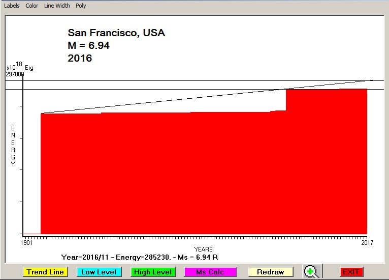 City : San Francisco, USA. Geographical coordinates : Lat : 37.78 N - Lon : 122.42 W Data base used : USGS (November, 2016). Radius of regional seismogenic area : 150 Km. Accumulated seismic energy expressed in terms of EQ magnitude : M = 6.94 Fig. 1. Equivalent EQ magnitude due to application of the LSEFM (Lithospheric Seismic Energy Flow Model) on past seismic history of the regional seismogenic area.