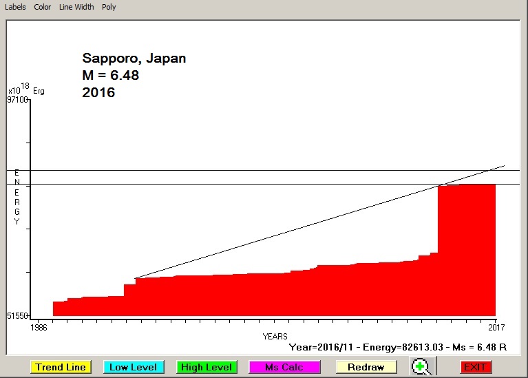 City : Sapporo, Japan. Geographical coordinates : Lat : 43.08 N - Lon : 141.38 E Data base used : USGS (November, 2016). Radius of regional seismogenic area : 150 Km. Accumulated seismic energy expressed in terms of EQ magnitude : M = 6.48 Fig. 1. Equivalent EQ magnitude due to application of the LSEFM (Lithospheric Seismic Energy Flow Model) on past seismic history of the regional seismogenic area.