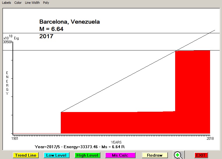 City : Barcelona , Venezuela. Geographical coordinates : Lat : 10.136 N - Lon : -64.686 W Data base used : USGS (May, 2017). Radius of regional seismogenic area : 150 Km. Accumulated seismic energy expressed in terms of EQ magnitude : M = 6.64 Fig. 1. Equivalent EQ magnitude due to application of the LSEFM (Lithospheric Seismic Energy Flow Model) on past seismic history of the regional seismogenic area.