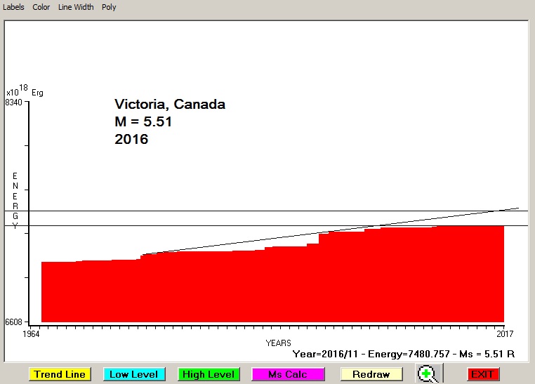 City : Victoria, Canada. Geographical coordinates : Lat : 48.43 N - Lon : 123.37 W Data base used : USGS (November, 2016). Radius of regional seismogenic area : 150 Km. Accumulated seismic energy expressed in terms of EQ magnitude : M = 5.51 Fig. 1. Equivalent EQ magnitude due to application of the LSEFM (Lithospheric Seismic Energy Flow Model) on past seismic history of the regional seismogenic area.