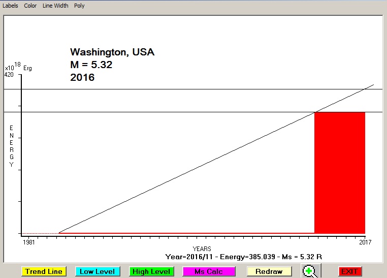 City : Washigton, USA. Geographical coordinates : Lat : 38.90 N - Lon : 77.02 W Data base used : USGS (November, 2016). Radius of regional seismogenic area : 150 Km. Accumulated seismic energy expressed in terms of EQ magnitude : M = 5.32 Fig. 1. Equivalent EQ magnitude due to application of the LSEFM (Lithospheric Seismic Energy Flow Model) on past seismic history of the regional seismogenic area.
