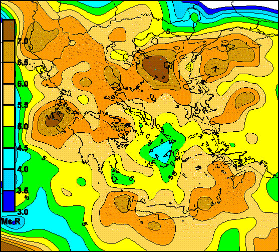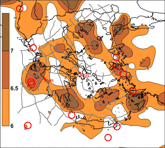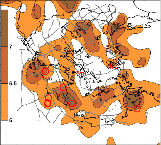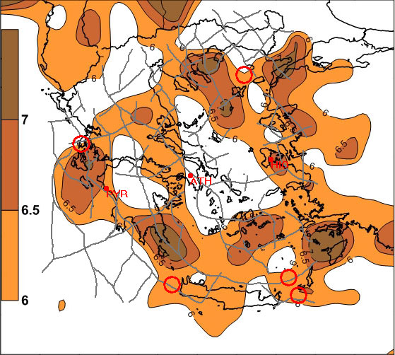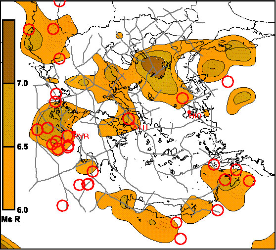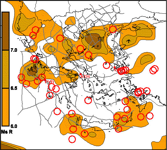 Fig. 8a. Strong seismic events (red circles, Ms> = 6R) during the period 2006 – 2010.
