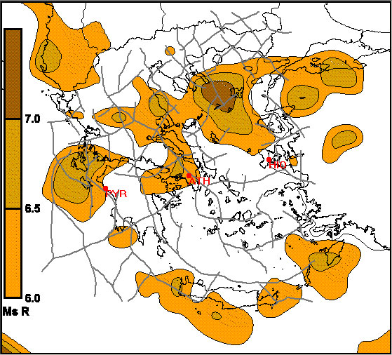 Fig. 8. Calculated seismic potential map, based, on data from 1900 to 2005