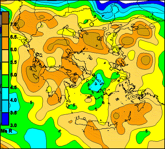 Fig. 1. Calculated seismic potential map, based, on data from 1950 to 1970
