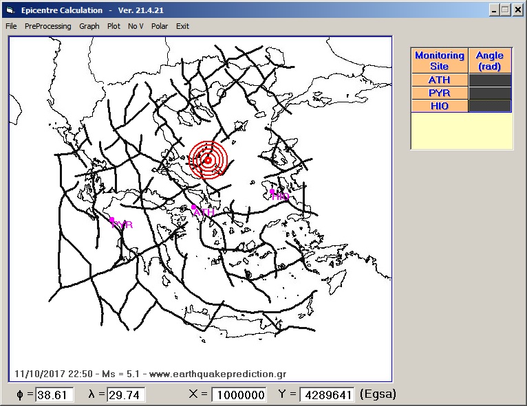 Fig.5. EQ epicenter location (red concentric circles) compared to the deep lithospheric fracture zones - faults (thick black lines) that have been determined by the processing of the gravity map of the Greek territory (in monograph references: Thanassoulas, C. 1998 and in chapter 2.1.1 Mapping of major seismic fracture zones and faults).