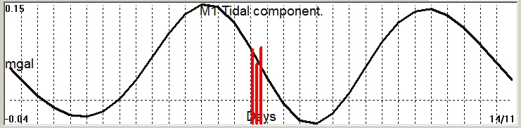 Fig. 2. M1 tidal variation (black line)  v.s time of occurrence (red bar) of the  EQ.