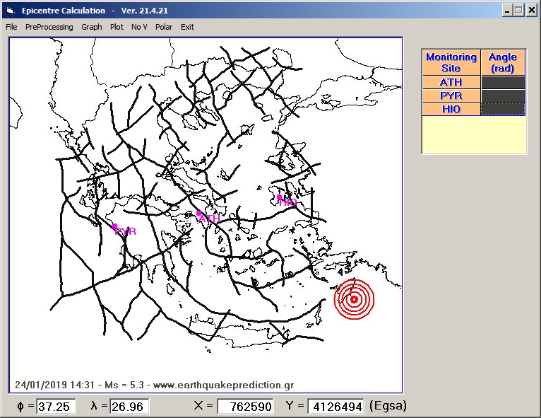 Fig.5. EQ epicenter location (red concentric circles) compared to the deep lithospheric fracture zones - faults (thick black lines) that have been determined by the processing of the gravity map of the Greek territory (in monograph references: Thanassoulas, C. 1998 and in chapter 2.1.1 Mapping of major seismic fracture zones and faults).