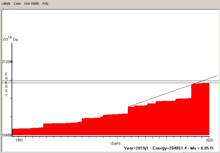 Fig. 4. Expected EQ magnitude due to application of the LSEFM (Lithospheric Seismic Energy Flow Model) on past seismic history of the regional seismogenic area.