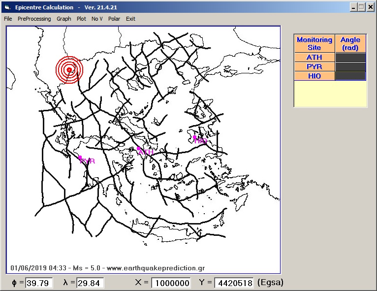 Fig.6. EQ epicenter location (red concentric circles) compared to the deep lithospheric fracture zones - faults (thick black lines) that have been determined by the processing of the gravity map of the Greek territory (in monograph references: Thanassoulas, C. 1998 and in chapter 2.1.1 Mapping of major seismic fracture zones and faults).