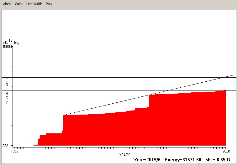 Fig. 5. Expected EQ magnitude due to application of the LSEFM (Lithospheric Seismic Energy Flow Model) on past (since 1999) seismic history of the regional seismogenic area.