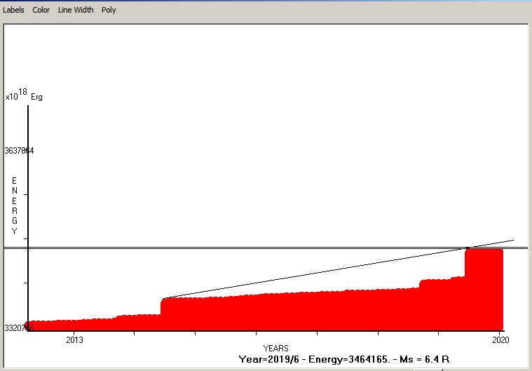 Fig. 5. Expected EQ magnitude due to application of the LSEFM (Lithospheric Seismic Energy Flow Model) on past (since 2012) seismic history of the regional seismogenic area.
