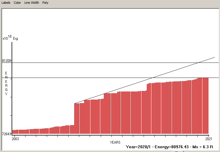 Fig. 4. Expected EQ magnitude due to application of the LSEFM (Lithospheric Seismic Energy Flow Model) on past (since 2003) seismic history of the regional seismogenic area.