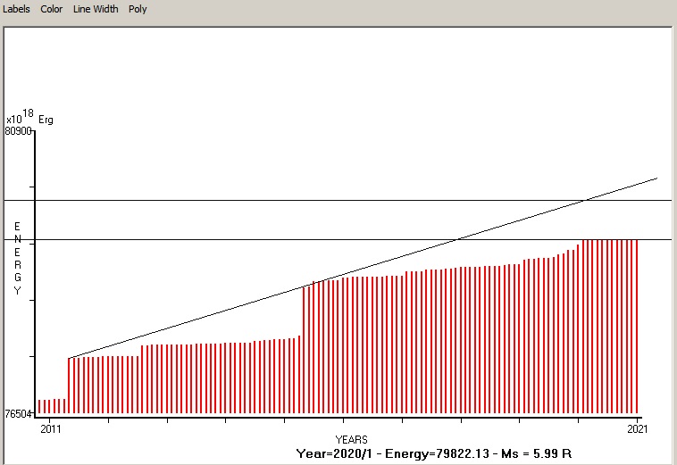 Fig. 5. Expected EQ magnitude due to application of the LSEFM (Lithospheric Seismic Energy Flow Model) on past (since 2011) seismic history of the regional seismogenic area.