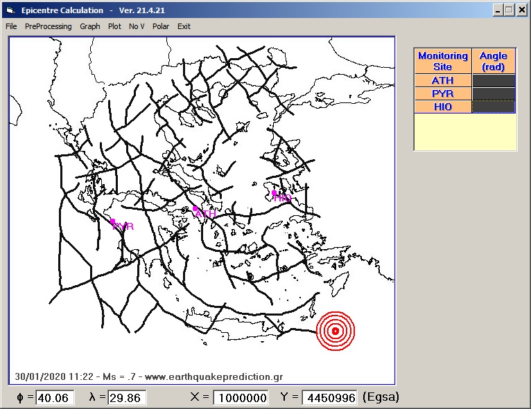 Fig.6. EQ epicenter location (red concentric circles) compared to the deep lithospheric fracture zones - faults (thick black lines) that have been determined by the processing of the gravity map of the Greek territory (in monograph references: Thanassoulas, C. 1998 and in chapter 2.1.1 Mapping of major seismic fracture zones and faults).
