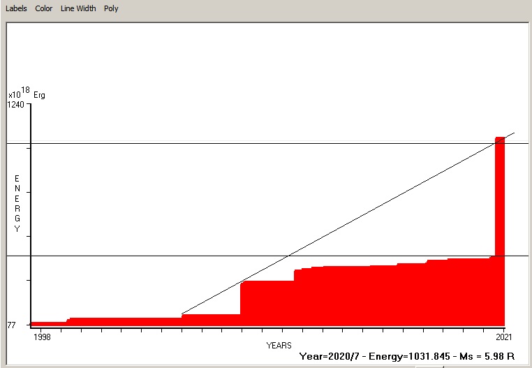 Fig. 5. Expected EQ magnitude due to application of the LSEFM (Lithospheric Seismic Energy Flow Model) on past (since ----) seismic history of the regional seismogenic area.
