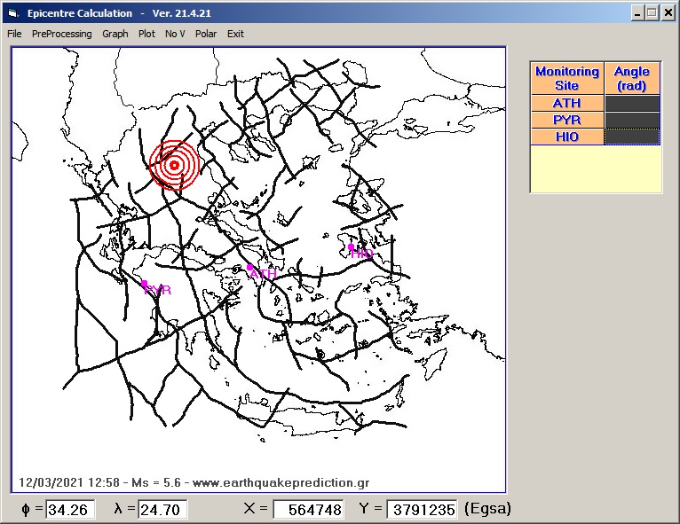 Fig.6. EQ epicenter location (red concentric circles) compared to the deep lithospheric fracture zones - faults (thick black lines) that have been determined by the processing of the gravity map of the Greek territory (in monograph references: Thanassoulas, C. 1998 and in chapter 2.1.1 Mapping of major seismic fracture zones and faults).