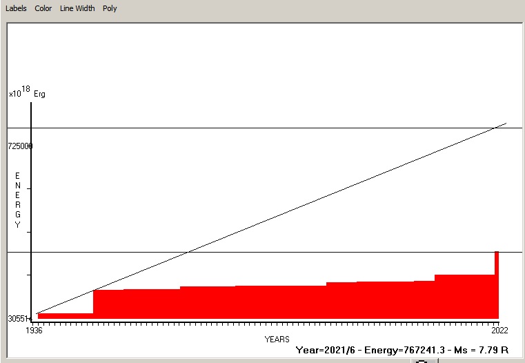 Fig. 4. Expected EQ magnitude due to application of the LSEFM (Lithospheric Seismic Energy Flow Model) on past (since 1936) seismic history of the regional seismogenic area.