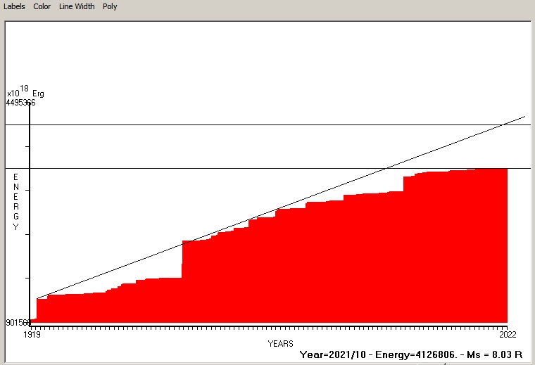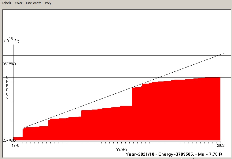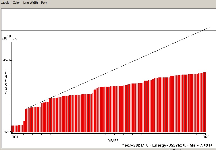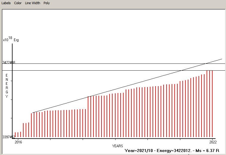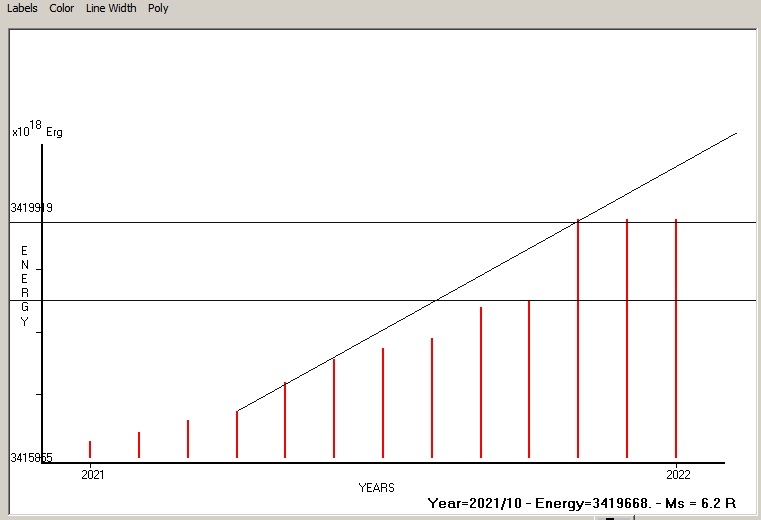Fig. 9. Expected EQ magnitude due to application of the LSEFM (Lithospheric Seismic Energy Flow Model) on past (since 2021) seismic history of the regional seismogenic area. Contact us at : gthanding@gmail.com