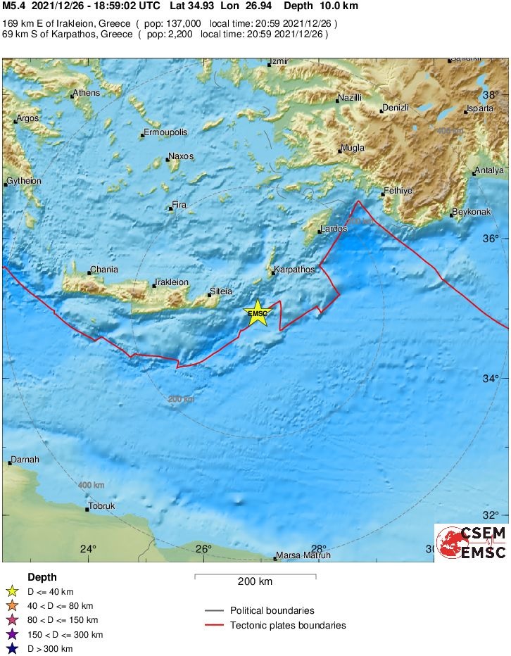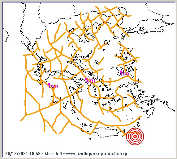 Fig.6. EQ epicenter location (red concentric circles) compared to the deep lithospheric fracture zones - faults (thick brown lines) that have been determined by the processing of the gravity map of the Greek territory (Thanassoulas, 1998).