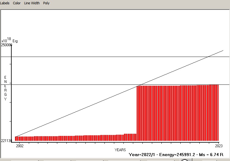 Fig. 7. Expected EQ magnitude due to application of the LSEFM (Lithospheric Seismic Energy Flow Model) on past (since 2020-7) seismic history of the regional seismogenic area.