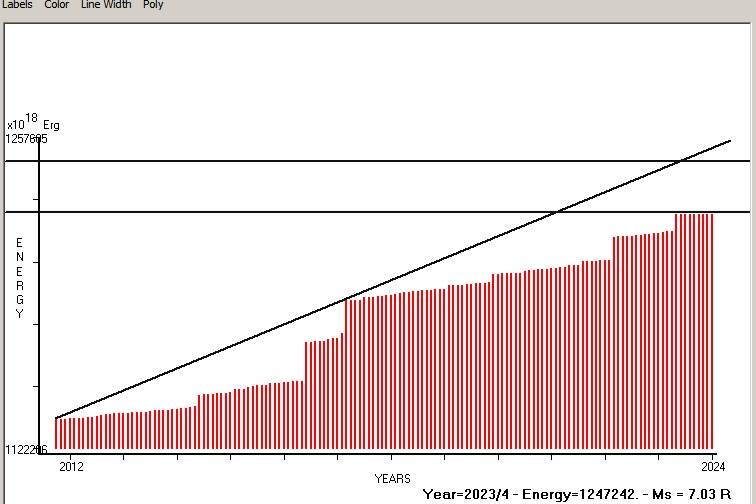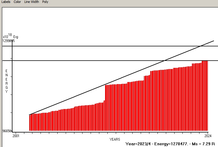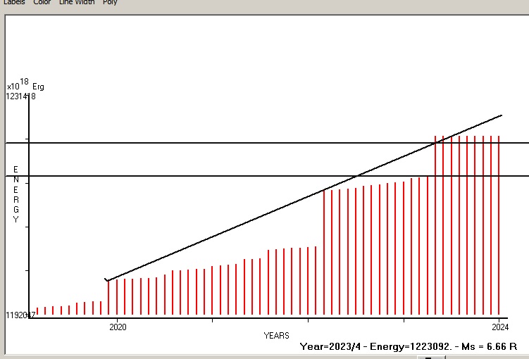 Fig. 8. Expected EQ magnitude due to application of the LSEFM (Lithospheric Seismic Energy Flow Model) on past (since 2019) seismic history of the regional seismogenic area. Contact us at : gthanding@gmail.com